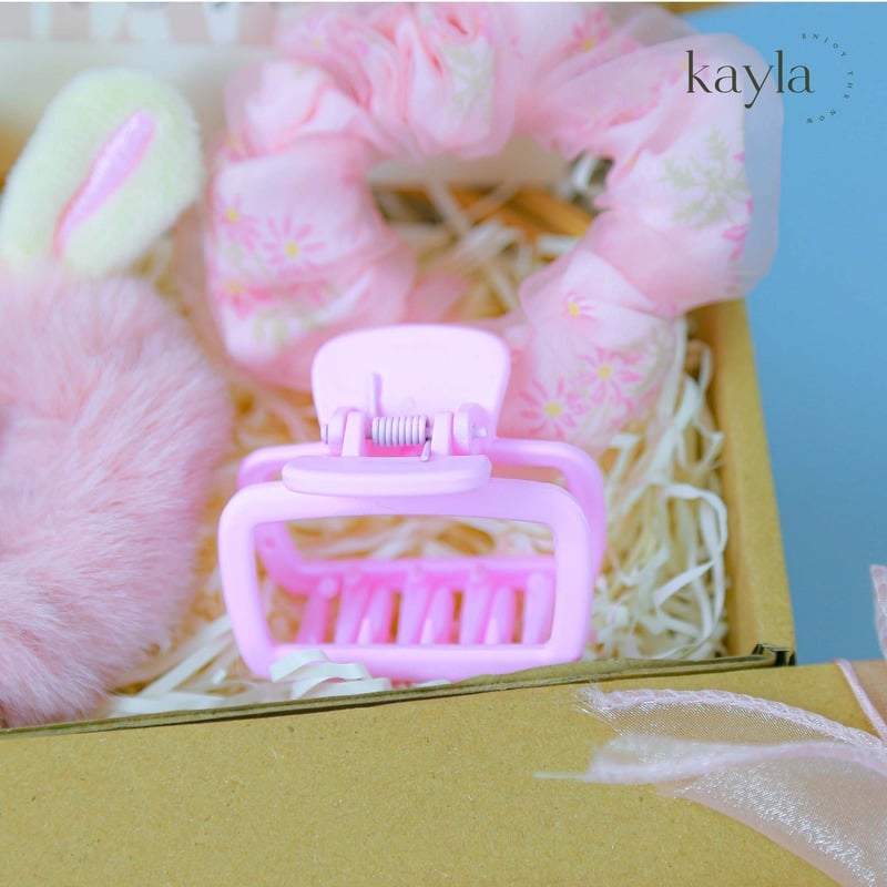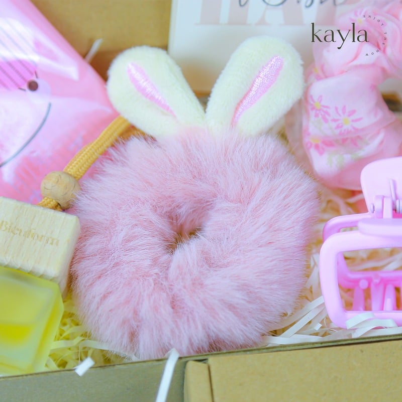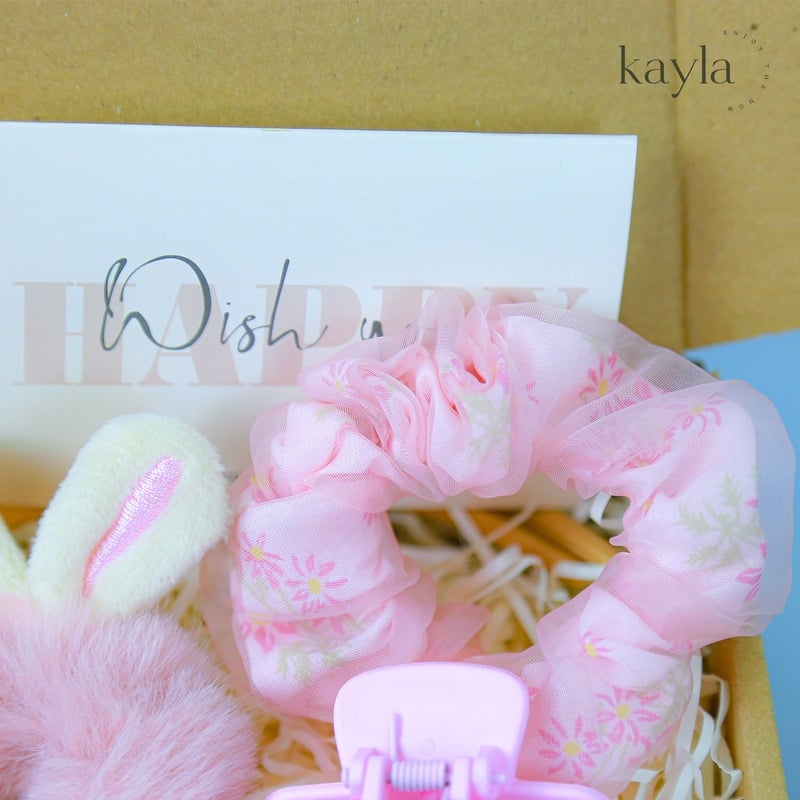 • Dây buộc tóc vải mềm màu hồng pastel – điểm nhấn nhẹ nhàng, phối được với mọi outfit.